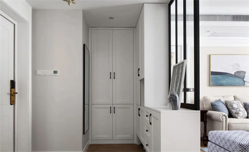有入戶花園的戶型,空間寬敞,做個L型或者U型的玄關柜都可以。甚至可以設計出衣帽柜、裝飾柜等,將家里的雜物都進行合理的收納。