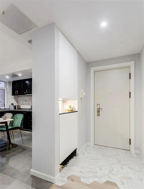 沿垂直于入戶門的墻面做一排鞋柜,要是入戶門位置到了墻角,厚度不夠的話,就選比較薄的成品鞋柜;再要不行,在墻面能敲的情況下,就敲墻吧,然后把鞋柜嵌進去。