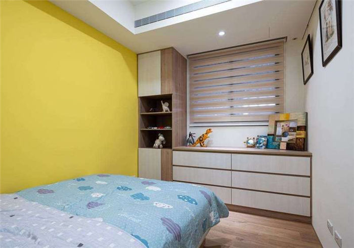 屋主也為常回娘家的女兒留了另一間主臥,優(yōu)雅的天青色背墻,以造型壁板美化,更衣室還有專設(shè)宛如明星般的梳化妝,簡(jiǎn)直將飯店規(guī)格搬回家;兒童房則以鮮艷檸檬黃搭配雙色收納柜,尤其是不對(duì)稱的門片設(shè)計(jì),更增童趣。