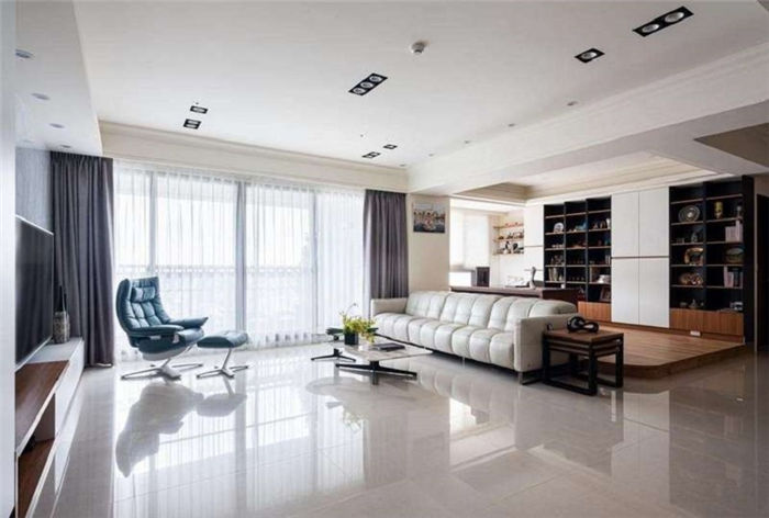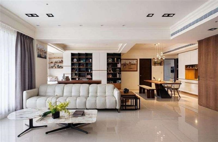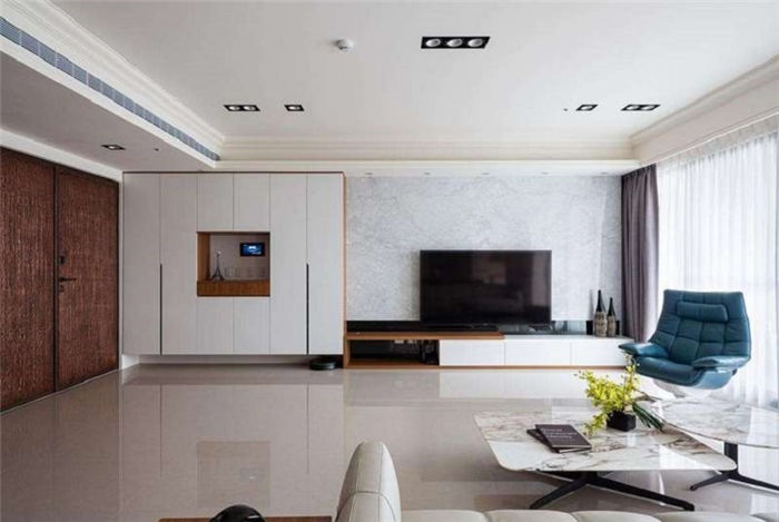 客廳大氣簡(jiǎn)約,收納充足不做滿 屋主不喜歡太多復(fù)雜的設(shè)計(jì),因此歐德設(shè)計(jì)師葛娜麗以大理石拼貼黑鏡為客廳電視主墻,彰顯屋主的大氣品味,入口不做獨(dú)立玄關(guān),而以白色搭配柚木色的系統(tǒng)柜充實(shí)鞋子與衣物的收納,中央以中空臺(tái)面打造畫框意象,生活小物與對(duì)講機(jī)、開(kāi)關(guān)彷彿都成為畫中一景。