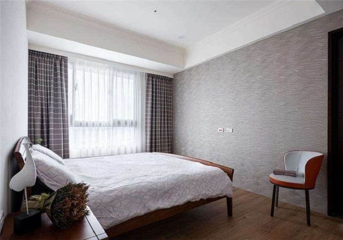 顏色造型一致,餐廳延續(xù)整體感 餐廳則有收納量極大的餐柜,顏色與造型一致呼應(yīng)客廳玄關(guān)柜,中空平臺(tái)鑲嵌鏡面,延伸景深并制造出映照的趣味,轉(zhuǎn)角則以三角邊柜圓弧收邊,讓長(zhǎng)者幼兒行走避免碰撞,更為安全。 主臥著重舒眠,結(jié)合機(jī)能與品味 長(zhǎng)輩主臥以素樸舒眠為主,灰色云紋壁紙十分雅致,床頭后方則隔出獨(dú)立更衣室,空間比例更為協(xié)調(diào),屋主能舒適躺在床上看電視。