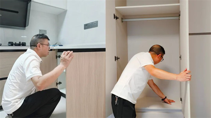 △我們的監(jiān)理正在對屋內的定制櫥柜、衣柜進行檢查,確認柜體是否水平垂直,