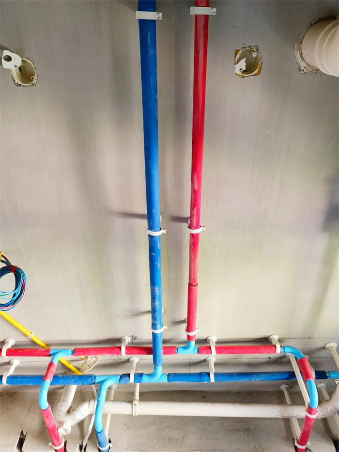 △水管排布感觀橫平豎直,墻體線(xiàn)槽內(nèi)給水管只能用整管,不允許用直接連接,合格。