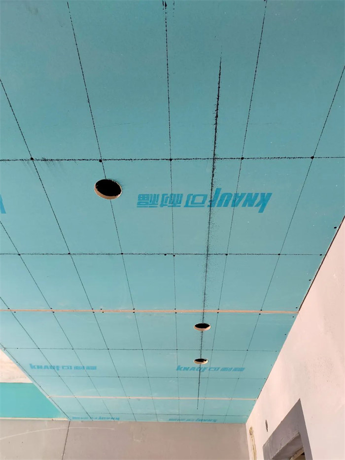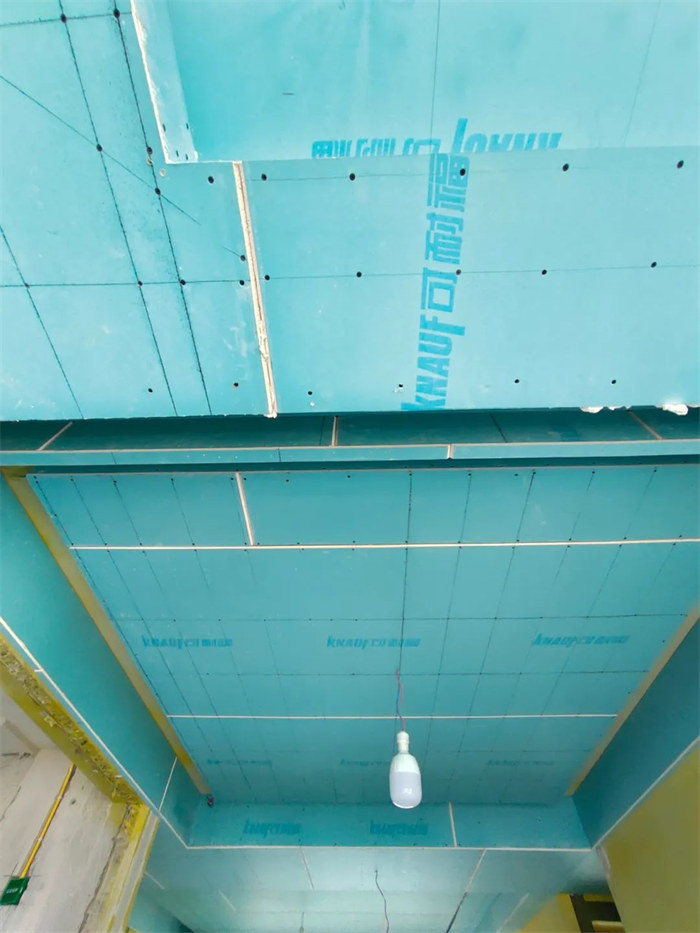 主龍骨的間距為800mm,墻邊距離200-300mm,吊棚外延口邊龍骨橫豎交叉時(shí)必須采用搭接及三角斜拉鉚固,吊筋與主龍骨銜接穩(wěn)固無(wú)松動(dòng);吊頂平梁,梁下過(guò)一層石膏板,厚度10mm,縫隙用發(fā)泡膠軟連接,所有石膏均要求切割平直,陽(yáng)角不允許用石膏板原邊,合格。