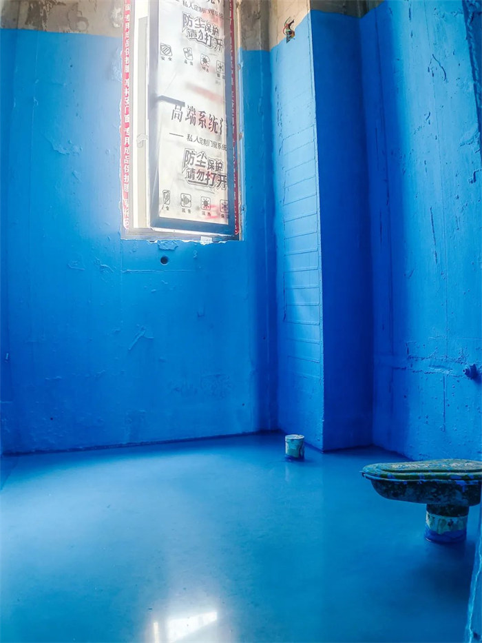 △衛(wèi)生間防水涂層均勻覆蓋在地面,施工無(wú)漏刷破損。