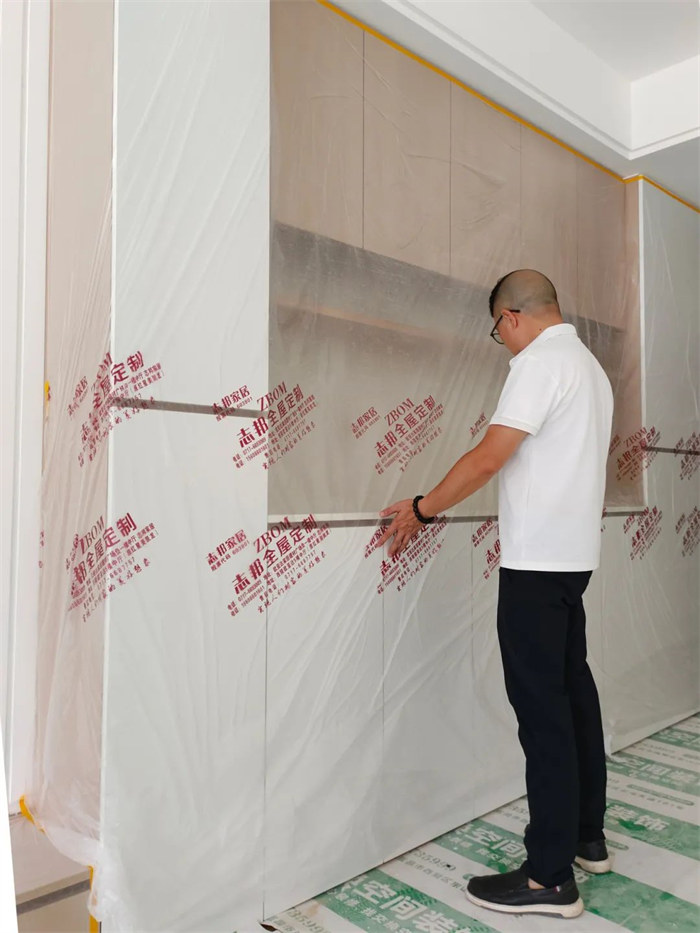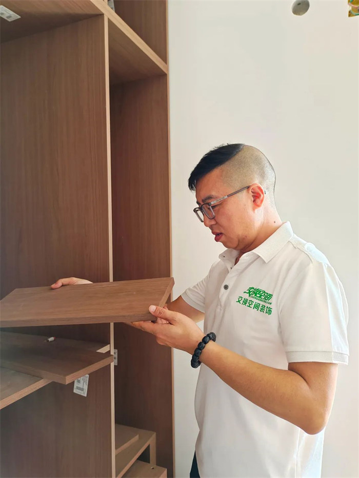 這是我們的監(jiān)理正在對(duì)屋內(nèi)定制柜進(jìn)行檢查,確認(rèn)柜體是否水平垂直,五金配件安裝牢固。檢查內(nèi)部隔板平整,無(wú)松動(dòng)。確保柜體表面無(wú)劃傷、瑕疵,安裝穩(wěn)固。