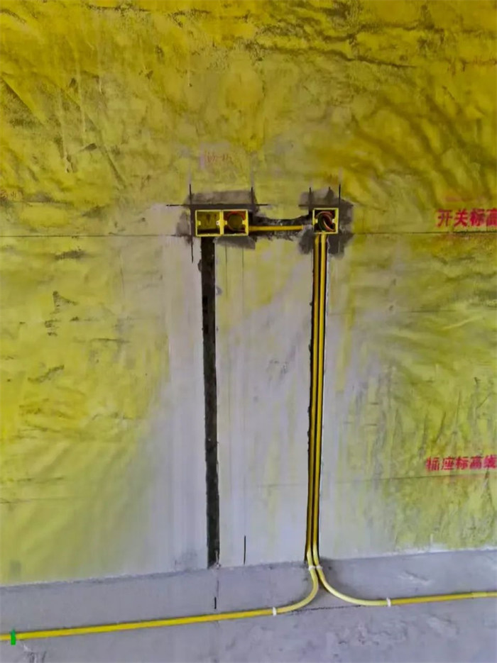△強弱電線管交叉,強電黃色、弱電綠色不允許混用,弱電線管整齊纏繞錫箔紙,兩頭平直,兩邊各超出強電線管150mm,合格。