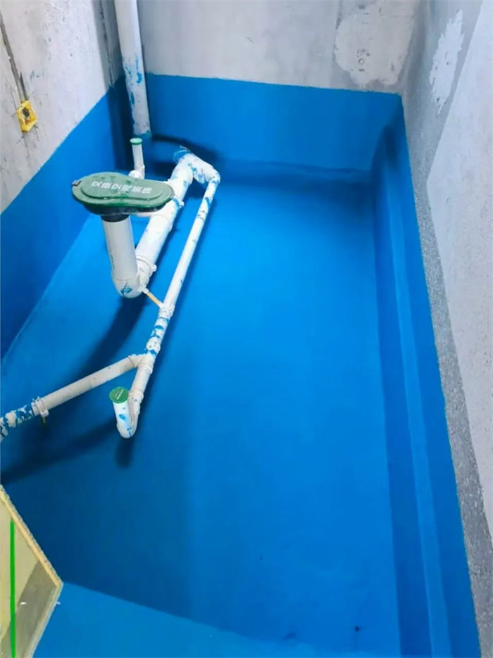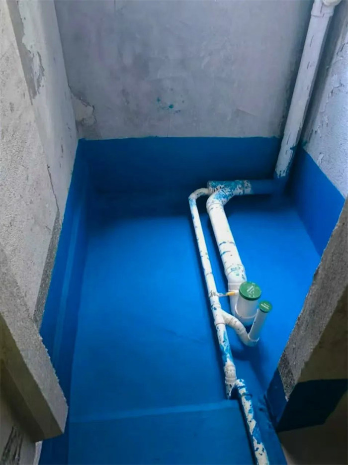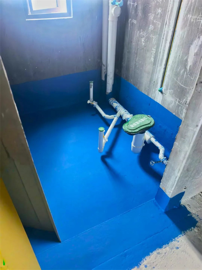 △衛(wèi)生間防水涂層均勻覆蓋在地面,施工無漏刷破損。