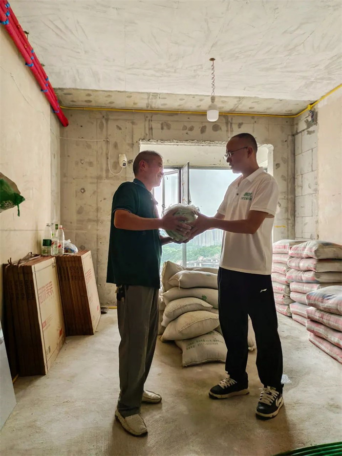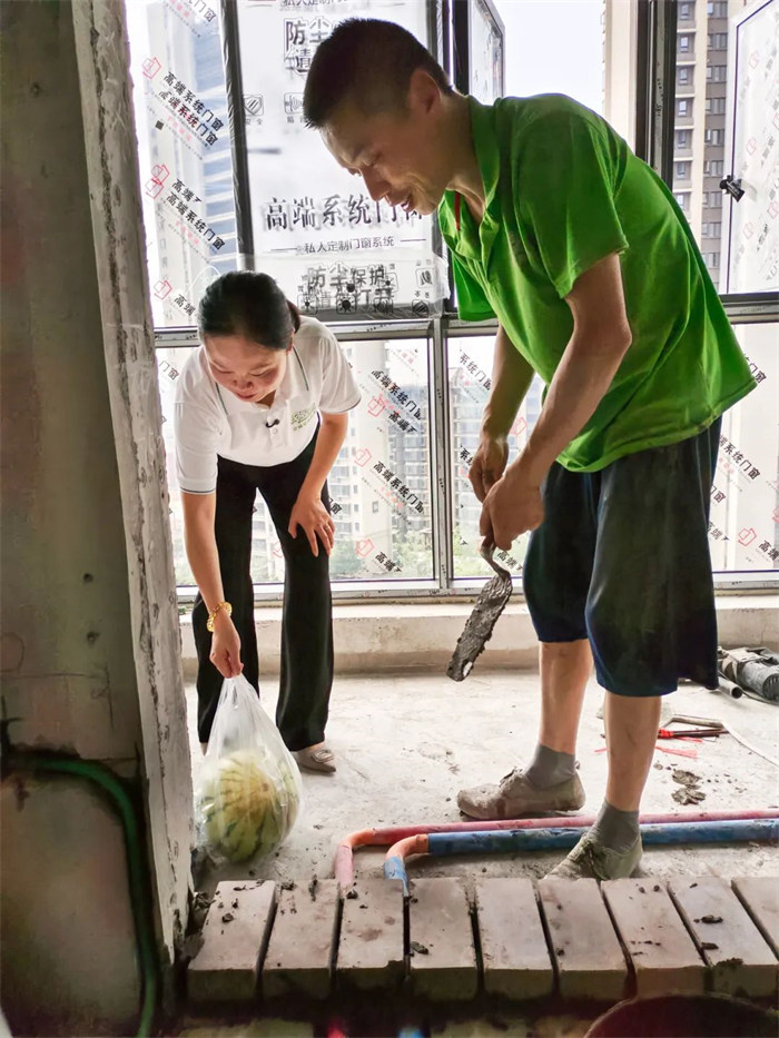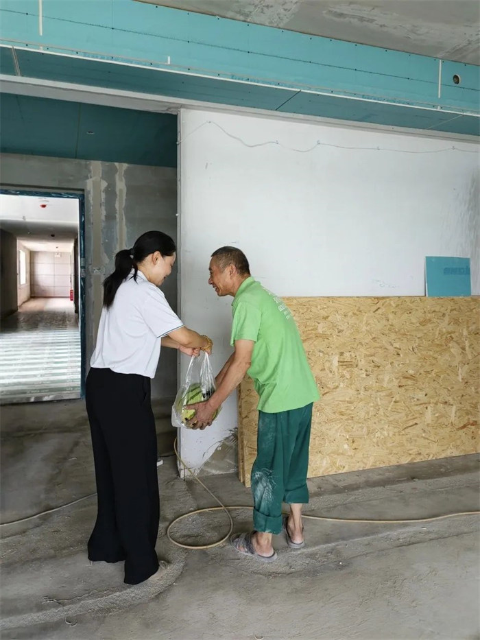 與工程部經(jīng)理一同深入工地現(xiàn)場,將滿載心意的清涼飲品與防暑物資送到每一位工人手中。