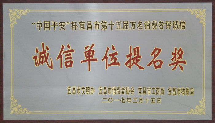 “中國平安”杯宜昌市第十五屆萬名消費(fèi)者評(píng)誠信“誠信單位提名獎(jiǎng)”