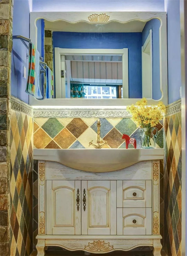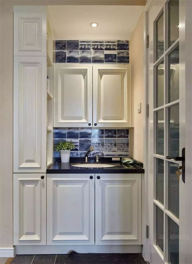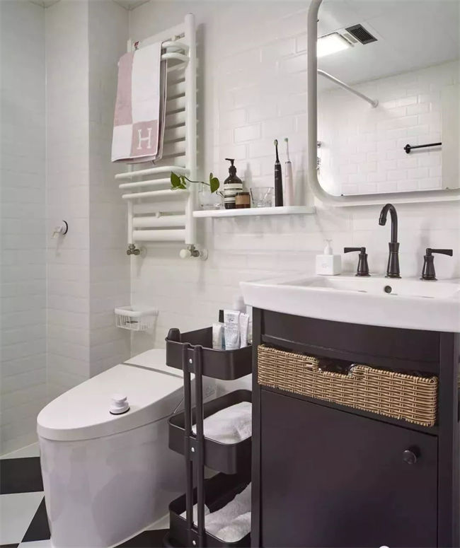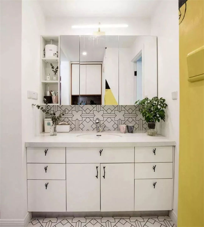 可以考慮把洗手臺的排水方式改成墻排,相對于傳統(tǒng)的地排而言,墻排可以讓臺盆下方的空間有更高的利用率。如果做地柜,下方柜子可利用空間更多;如果做吊柜,下方空間會顯得更加清爽,更容易打掃。