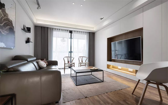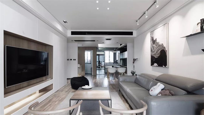 ▲整個客廳空間以現(xiàn)代時尚的簡約空間為主,以凈白與的墻面與木質(zhì)地板搭配下,