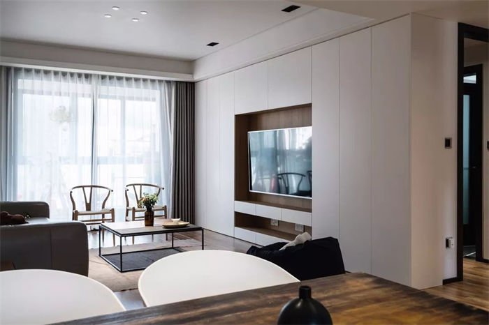▲入墻式的電視墻,把電視墻裝成收納柜,同時中間留出了電視機(jī)的孔位,
