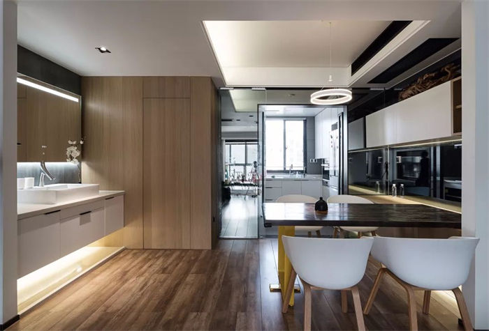 ▲餐廳一側(cè)就是洗手盆,側(cè)邊的木飾面打造的墻體裝上一個隱形門,潔凈的洗手盆結(jié)合木質(zhì)感的空間,