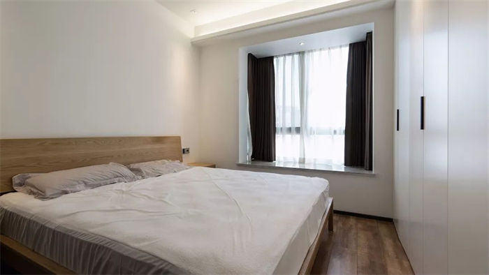 ▲主臥空間擺上一張木質(zhì)床與2個床頭柜,飄窗上裝著一個擋光窗簾,床尾的衣柜簡潔通頂,把整個空間都裝扮得格外的舒適時尚。