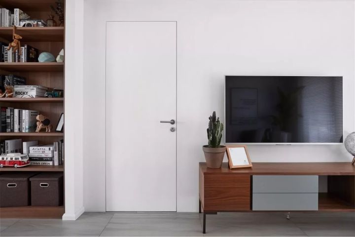 電視背景墻簡單的刷白漆,所以很好的把進入臥室的門藏起來了,這就是我們常常聽到的隱形門。