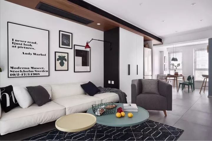 陽臺推拉門的墻面刷成青色,沙發(fā)背景墻刷白漆并用一組掛畫裝飾,再搭配舒適的淺色沙發(fā)、灰色椅子,地面再鋪上一塊地毯,簡約舒適的客廳就出來了。