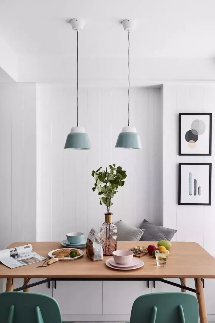 兩盞單頭吊燈正對的餐桌,讓就餐顯得更加有情調。