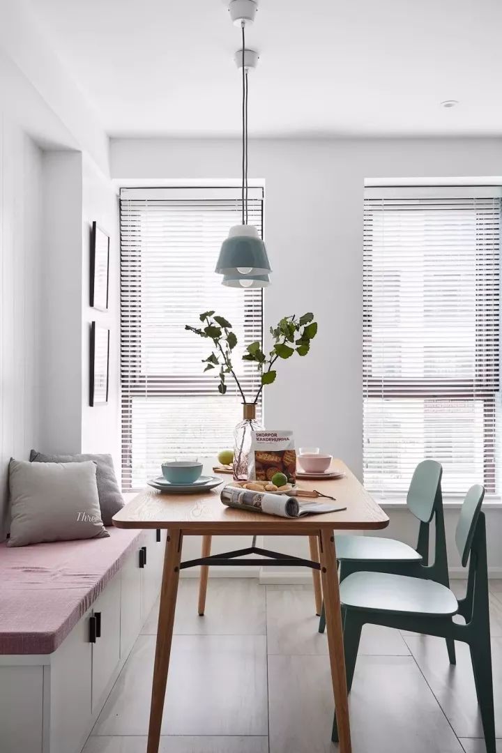 同時還設計了卡座,搭配木色的餐桌,青色的椅子,溫馨中又帶有活力,很適合浪漫的小兩口燭光晚餐。