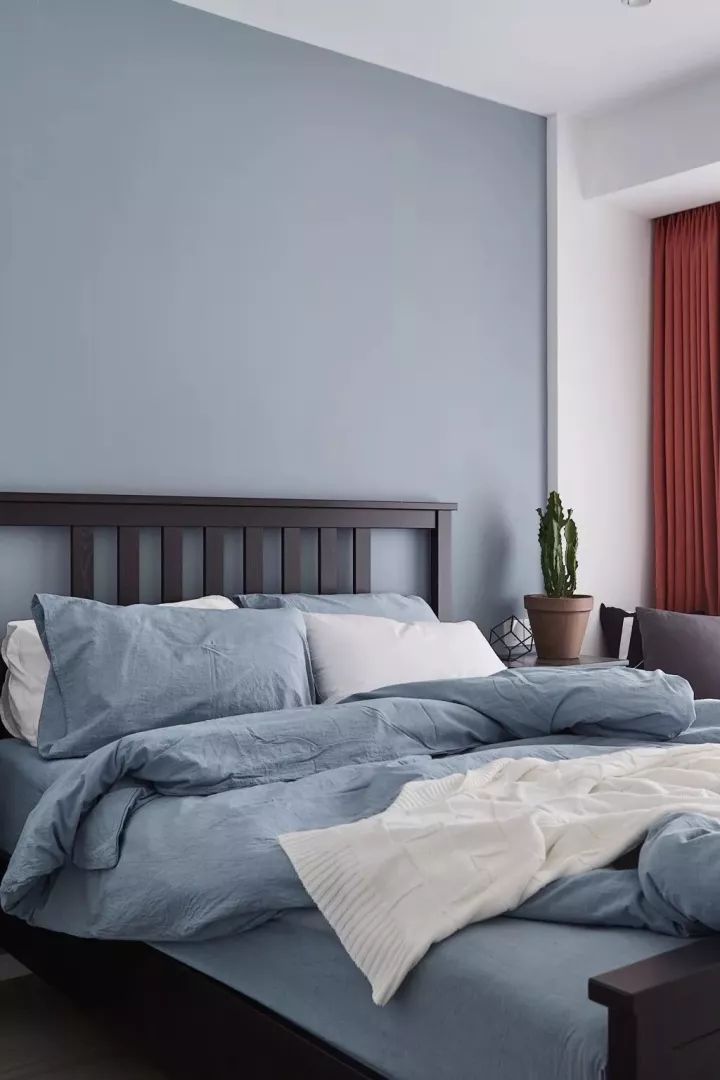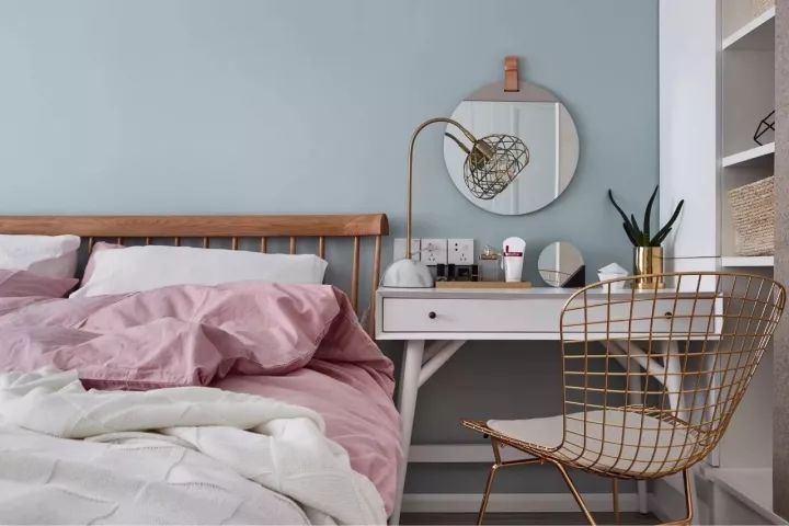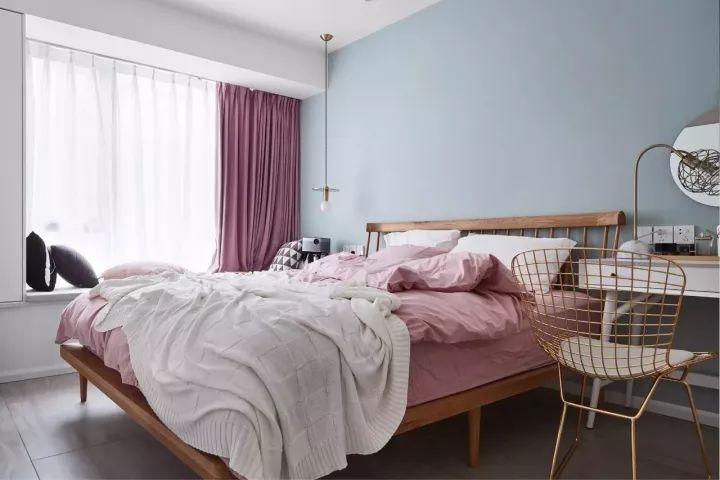 藍色的背景墻,選用木色的床,再搭配粉色的被子,這樣的組合讓人百看不厭。