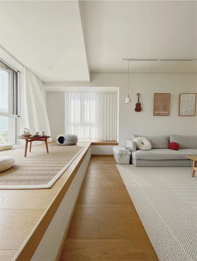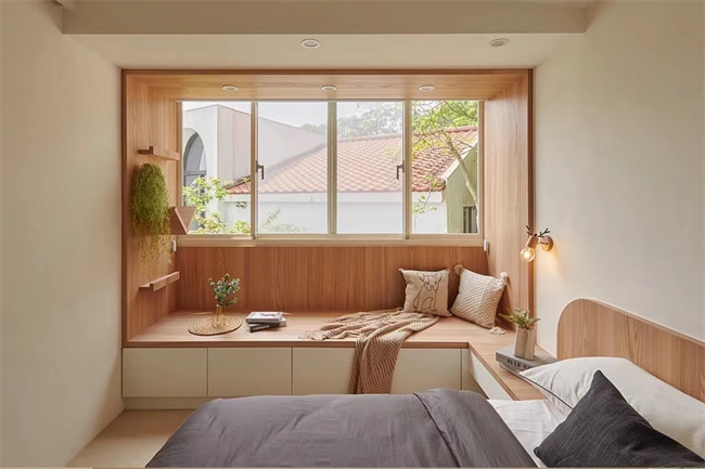 在一些原木風(fēng)的空間中,為了保持空間的統(tǒng)一,飄窗臺也可以選擇木質(zhì)的,比如木地板或防腐木之類的,效果簡約自然。