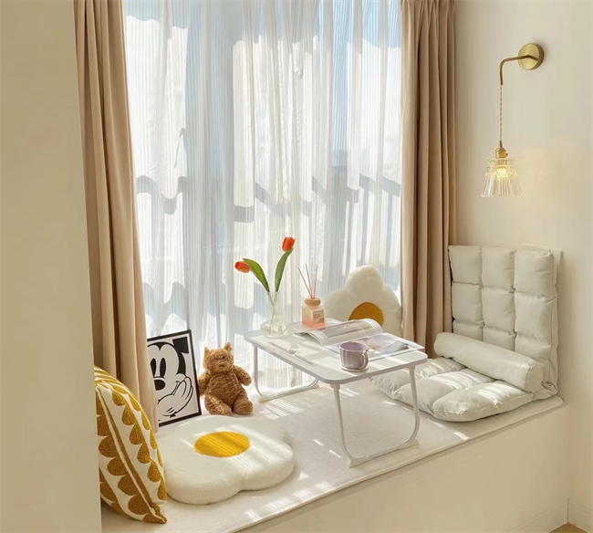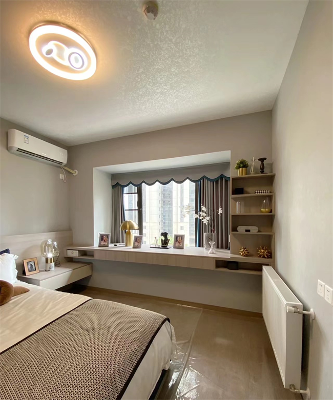 對于房間小,擺不下書桌的情況,可以把飄窗墊高,作為書桌臺面功能。