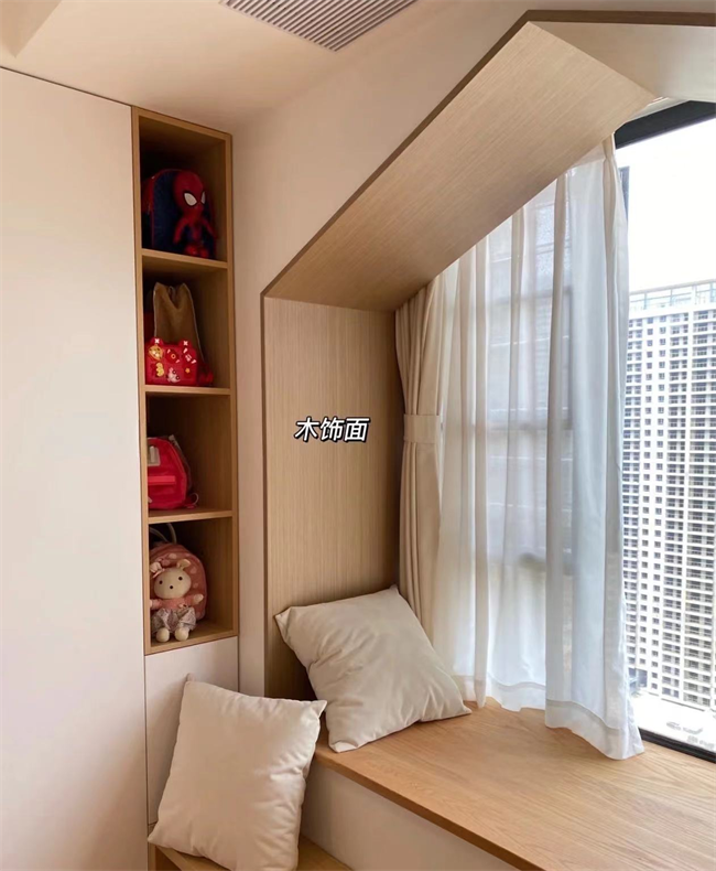 除了窗臺,飄窗側(cè)邊也是有比較寬的墻體,為了增加飄窗的溫馨與耐用質(zhì)感,可以選擇在飄窗側(cè)邊裝一層木飾面,這樣可以讓飄窗更加溫馨自然,而且還可以實現(xiàn)防撞與耐用的保護功能。