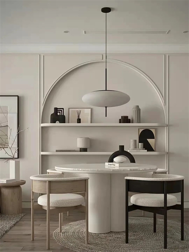 選擇內(nèi)嵌筒燈這種簡(jiǎn)潔又提升亮度的燈具,讓天花板盡可能的簡(jiǎn)單,空間會(huì)顯得更透亮。如果喜歡吊燈,一定要避開(kāi)那些十分復(fù)雜的款式,吊燈的位置要在桌面上方290cm處,這樣才能發(fā)揮其特性,讓人感覺(jué)天花板更加遙遠(yuǎn)。