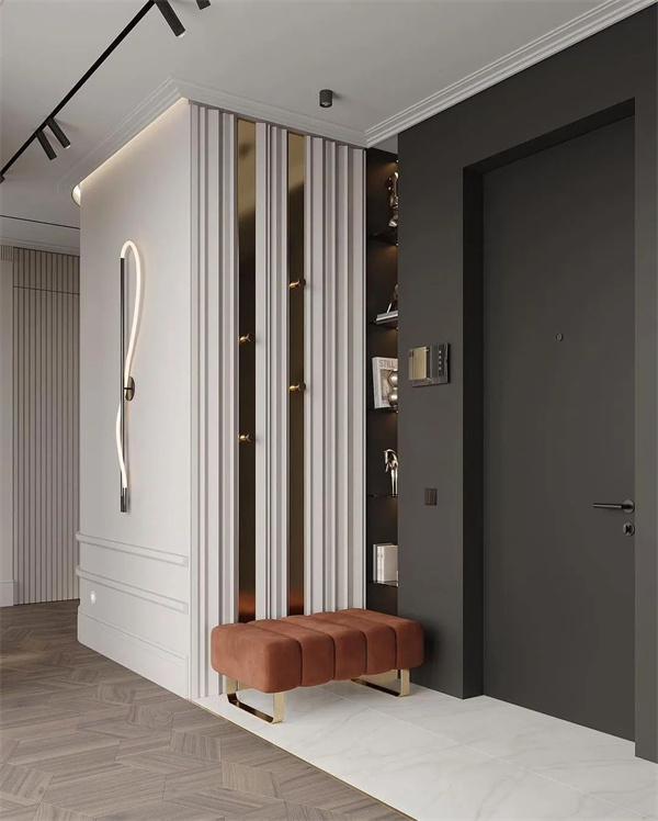 門(mén)廳是連接室內(nèi)與室外的橋梁,在門(mén)廳處打造一個(gè)高柜,方便存放鞋子、外套、鑰匙、手提包等,這樣可以把雜物統(tǒng)統(tǒng)隱藏起來(lái),還門(mén)廳一個(gè)清爽環(huán)境。
