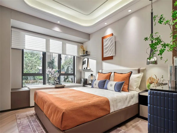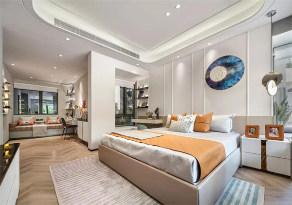 設(shè)計建議:將臥室空調(diào)安裝床尾側(cè)方的墻面上,這樣空調(diào)風(fēng)會從側(cè)面或者通過室內(nèi)立面的反彈轉(zhuǎn)吹到床上,整體的風(fēng)力比較舒適柔和。