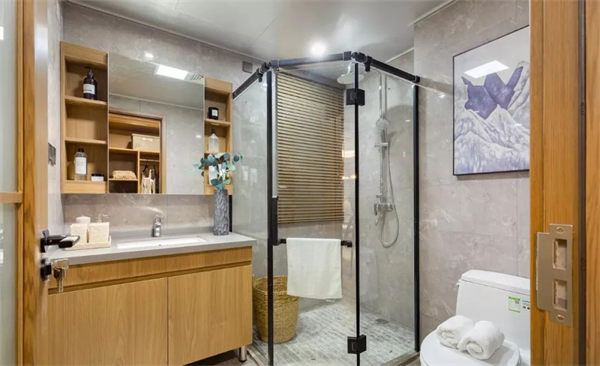 設(shè)計建議:將衛(wèi)生間的干區(qū)外置,使用淋浴區(qū)和馬桶區(qū)域的時候,也不會影響到外面的洗漱區(qū)域。在淋浴區(qū)安裝玻璃門淋浴房,使用方便,也不用擔(dān)心水汽會影響到其他區(qū)域。