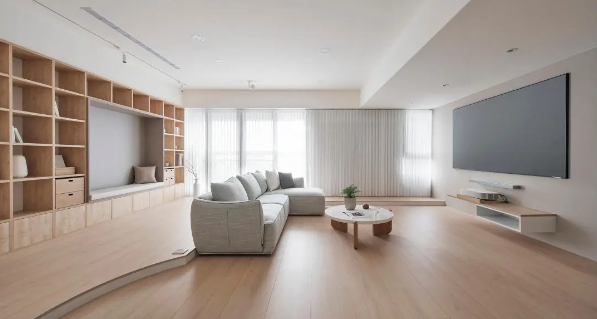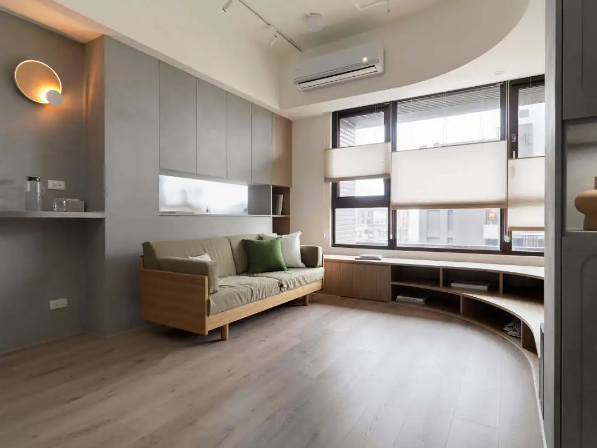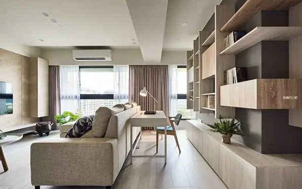 如果是小戶型的橫廳,想改造一個(gè)休閑小酌區(qū)域,我們可以將沙發(fā)靠墻,設(shè)計(jì)雙層地臺(tái)開(kāi)放格間,既可以當(dāng)做儲(chǔ)物收納的柜子,地臺(tái)與基礎(chǔ)地面形成的高度差可以增強(qiáng)視覺(jué)層次感,豐富整體空間的視覺(jué)效果。