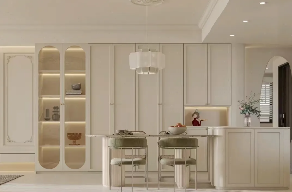 分為兩種情況,一種是直接將柜體與護墻板使用同樣的飾面材質(zhì),達到視覺上的效果統(tǒng)一;另一種是柜門使用與護墻板同樣的材質(zhì),與隱形門的設(shè)計一樣,達到柜子與墻面的完美結(jié)合。