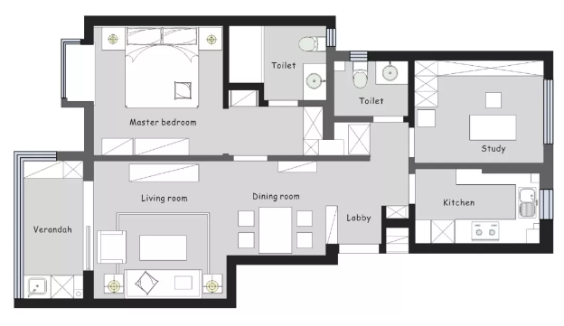 本案設(shè)計(jì)是以簡(jiǎn)約為主,選購(gòu)的家具與配飾以簡(jiǎn)潔的造型、完美的細(xì)節(jié),營(yíng)造出時(shí)尚前衛(wèi)的感覺(jué)。色彩上以灰色為主色調(diào),與屋內(nèi)現(xiàn)有的顏色相匹配,使整體居室充滿了愜意、輕松的氛圍。