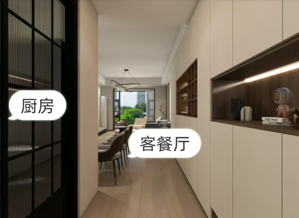 廚房與餐廳僅用玻璃門隔開,使餐廚區(qū)的聯(lián)系更加緊密更加明亮~