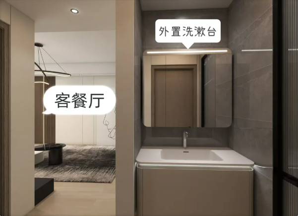 洗漱臺(tái)與廁所分離,美觀的同時(shí)也兼顧到家中客人的各種情況