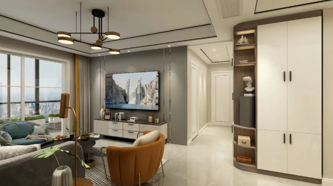 客廳背景墻的設(shè)計尤為精彩,通過護墻板與藝術(shù)畫的交錯搭配,形成了豐富的層次變化,電視墻更是采用了標準的懸掛設(shè)計,并配置有吊頂燈光,夜晚時分燈光傾瀉而出,瞬間提升整個空間的藝術(shù)氛圍。電視墻下方還設(shè)置了配套電視機柜,進一步強化了空間上的立體感。